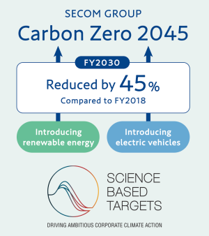 The SECOM Group has committed to the ‘SECOM Group Carbon Zero 2045’ initiative*1, aiming to achieve net-zero greenhouse gas emissions by 2045 for Scope 1 and 2 emissions across the entire group, with an interim goal of a 45% reduction in emissions by FY2030, compared to FY2018 levels (SBT certified). AT TOKYO, as a member of the group, will advance initiatives to achieve decarbonization targets. We also promote sustainable practices in procurement, waste reduction, and resource recycling, in alignment with the SECOM Group Environmental Policy.