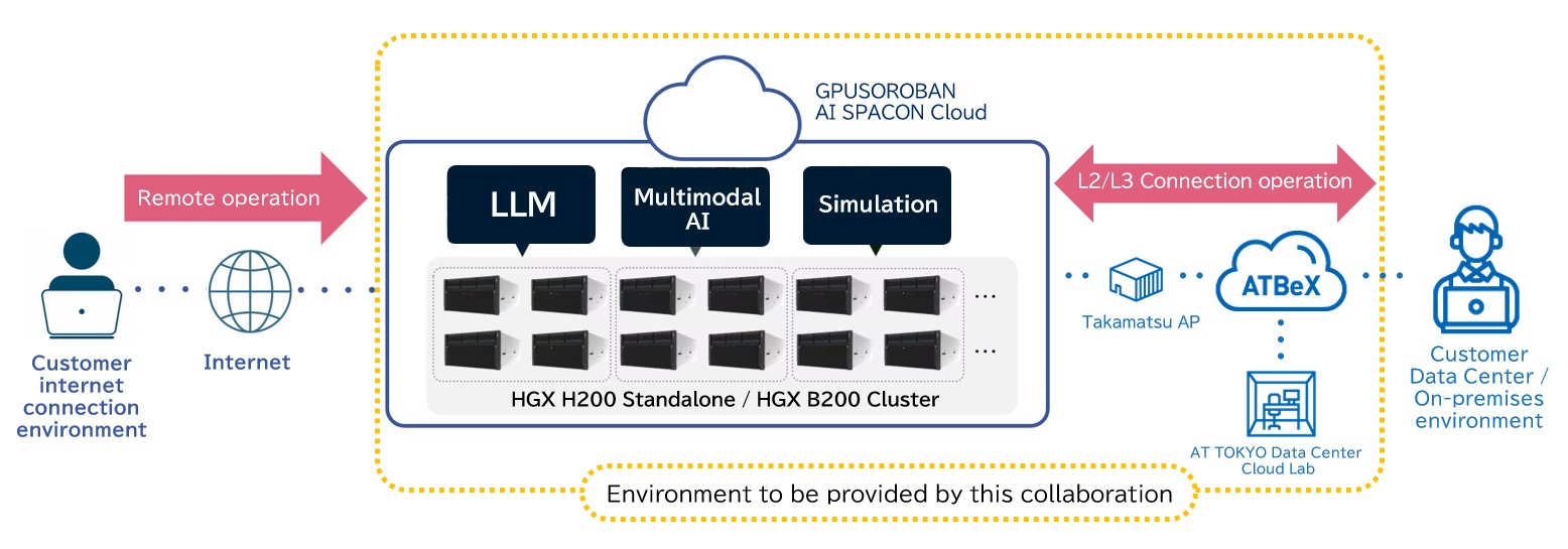 In this PoC, the companies will build an environment that combines HIGHRESO’s GPU cloud service, “GPUSOROBAN – AI SPACON Cloud” (hereinafter “AI SPACON Cloud”), with AT TOKYO’s “ATBeX (AT TOKYO Business eXchange),” a nationwide, flexible, and secure closed network platform. This environment will enable secure and efficient execution of tasks such as custom training using proprietary data for LLMs and simulations for confidential product development.